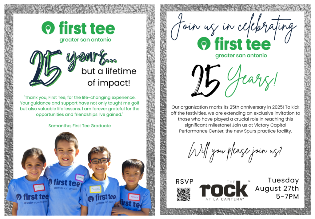 We couldn’t have done it without YOU! First Tee – Greater San Antonio marks it’s 25th anniversary in 2025! To kick off the year-long celebration, we are extending an exclusive invitation to those who have played a crucial role in reaching this significant milestone. Join us at Victory Capital Performance Center, the new San Antonio Spurs practice facility! Will you be joining us for this kickoff reception? Please RSVP below.